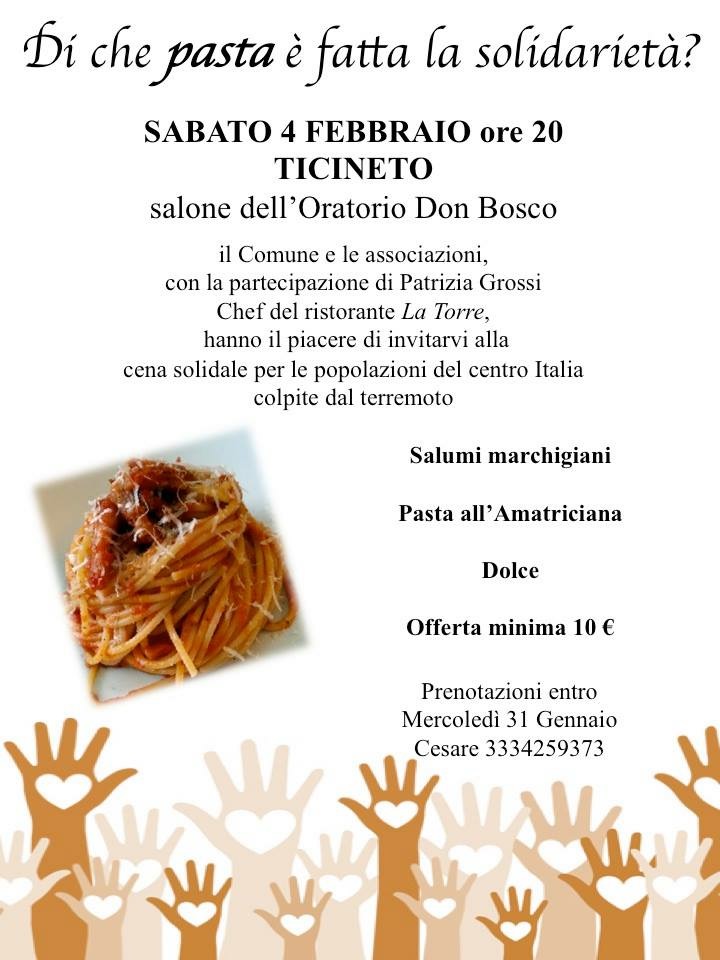 SABATO 4 FEBBRAIO 2017 ALLE ORE 20 PRESSO IL SALONE DELL'ORATORIO "D.BOSCO"-TICINETO-SI è SVOLTA CON SUCCESSO LA CENA SOLIDALE PER LE POPOLAZIONI COLPITE DAL TERREMOTO.